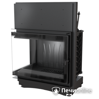 Г-образное стекло из жаропрочной стеклокерамики Robax® установлено поверх узкой рамки угловой дверцы, и увеличивает обзор на игру пламени из-за отсутствия чугунной стойки. Каминная топка предназначена для установки в колонну, во внешний выступ перегородки или на специальный подиум.